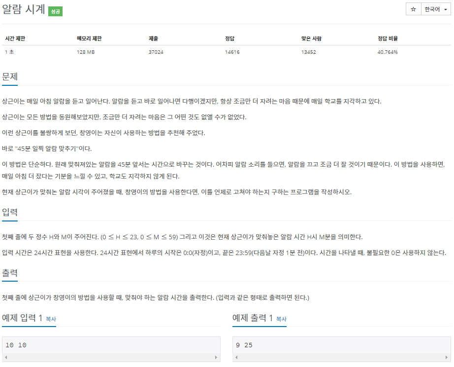 H,M = map(int,input().split()) t = (H*60)+M - 45 if(t<0) : t = (24*60) + t h = int(t/60) m = int(t%60) print(h,m)===
