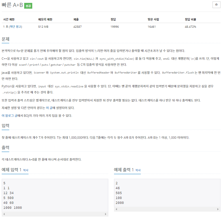 import sys n = int(sys.stdin.readline()) for i in range(n) : a,b = map(int,sys.stdin.readline().split()) print(a+b)입출력방식이 느린 input보다 sys.stdin.readline을 사용하였다