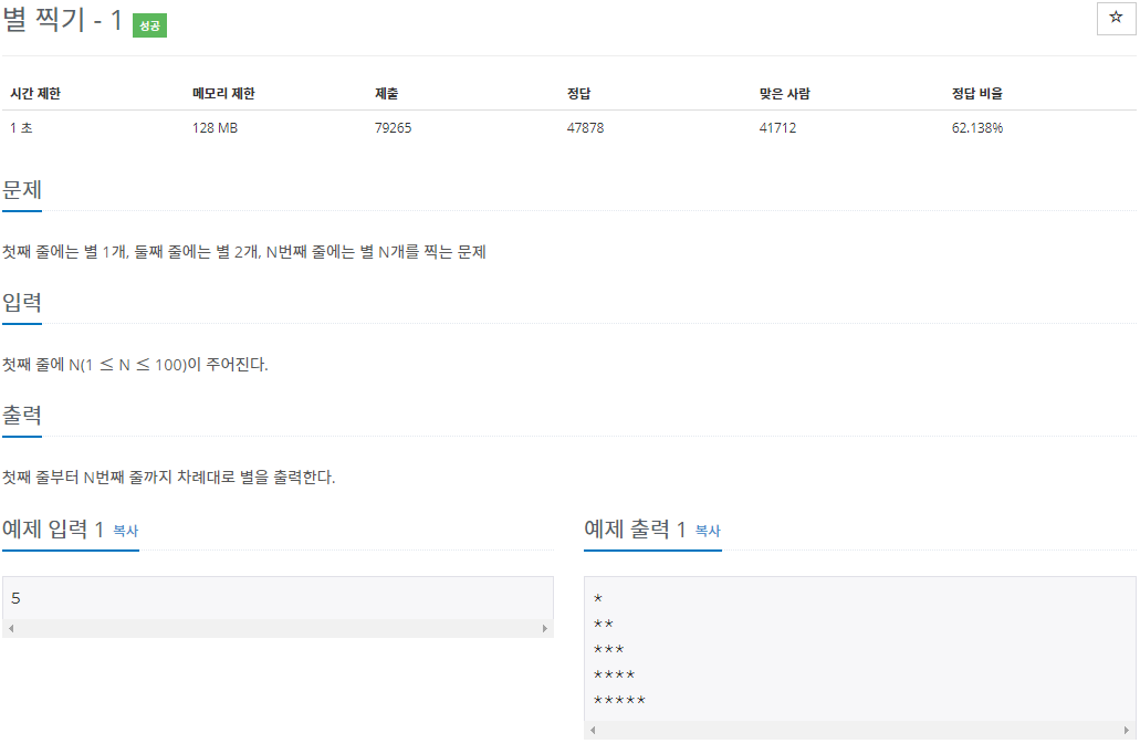 import sys n = int(sys.stdin.readline()) for i in range(n) : for j in range(i+1) : print("*", end ='', flush = True) print()end = ''로 줄 바꿈을 없애줌으로 별들을 겹치게 하고 flush로 버퍼가 넘치지 않게 했습니다